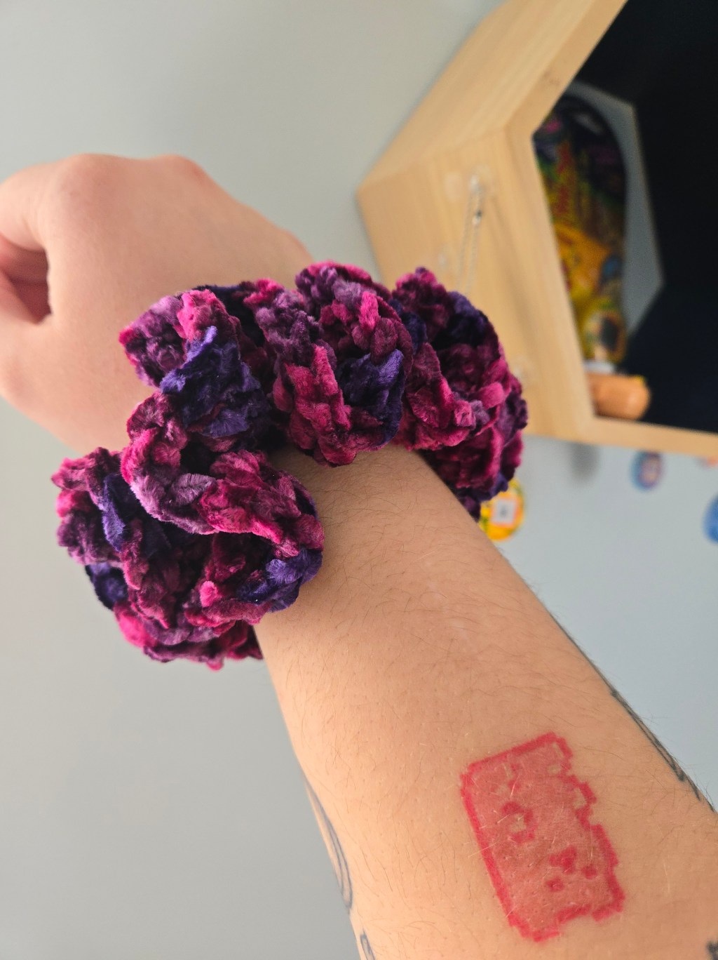 + bernat, finished crochet projects, finished projects, projects, quick crochet, scrunchie, velvet, velvet yarn, wearables, yarn+