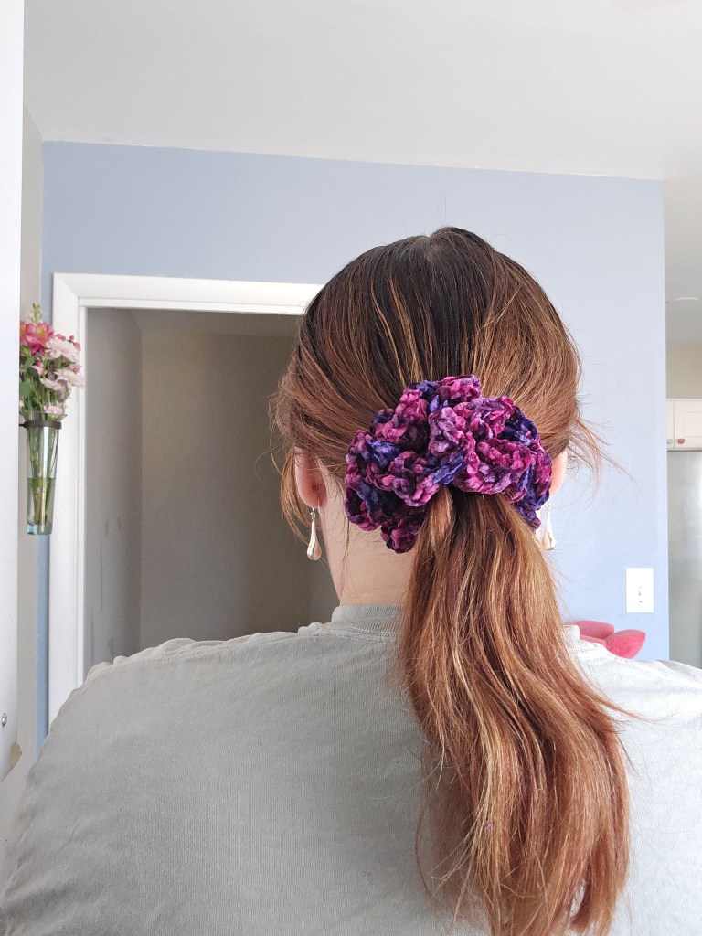 Today at work I wore my hair up in a pony tail, and had a satin hair tie overtop a normal elastic. I realized the satin tie didn’t fully cover the normal elastic, and thought, it’d be nice to wear a full scrunchie over this. However, I only have a few, and am not super wild about any of them. I am an amateur seamstress, so I thought about my fabric stash on the drive home and tried to pick out a fabric that would be cute as a scrunchie.