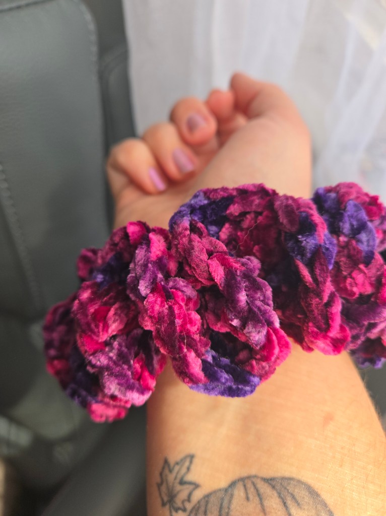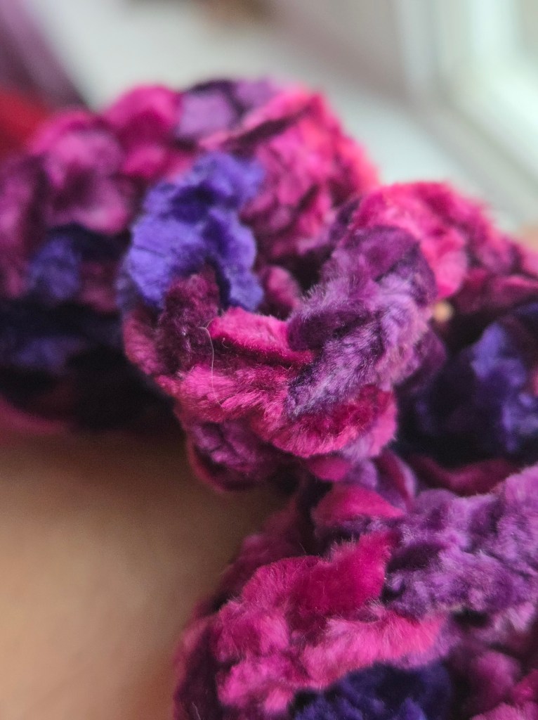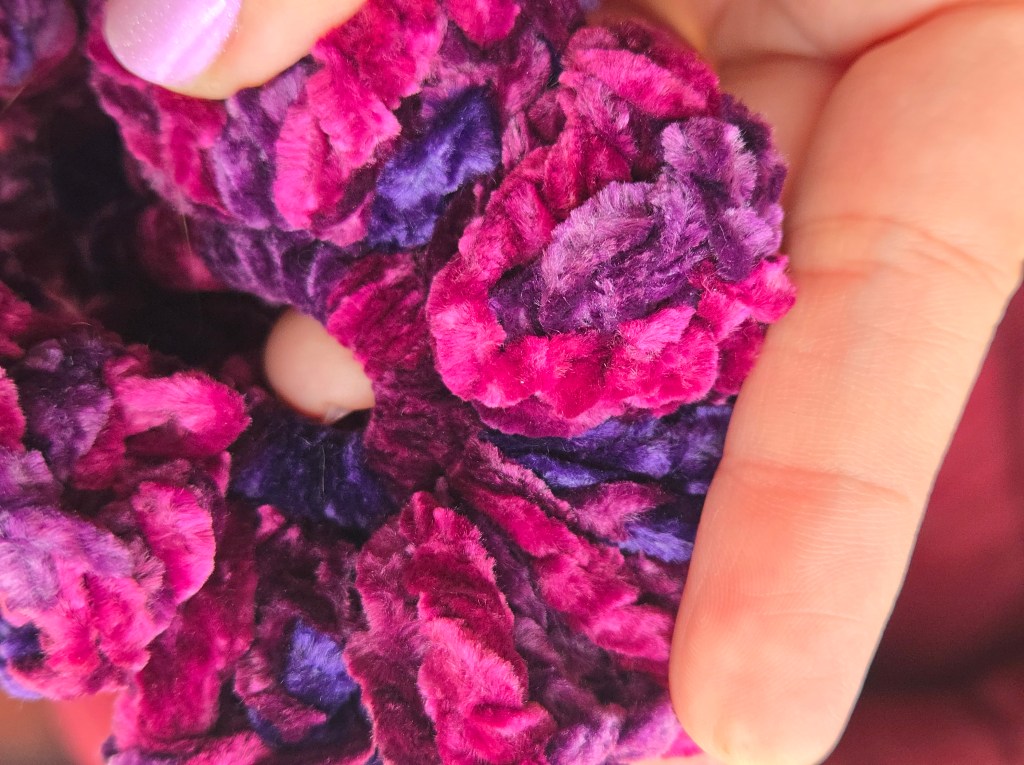 I followed this tutorial to crochet a scrunchie around a normal elastic. It specifically calls for velvet yarn, and I thought I just might be advanced enough to use it.