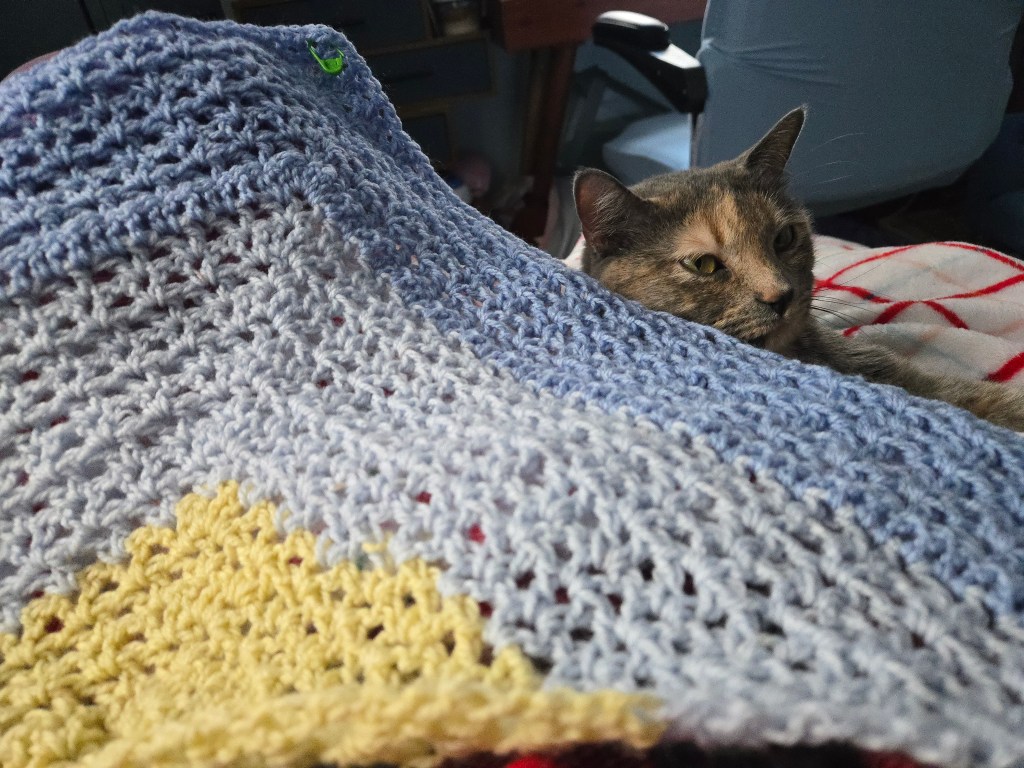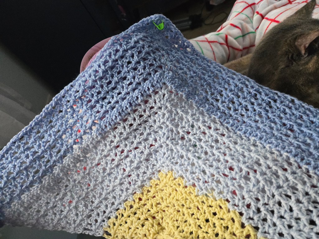 I’m at the end of row 23 at the time of taking this picture. The pattern calls for a worsted weight yarn (actually, the Mandala Ombre line.) I’m using the same hook size and achieving a more airy texture. I’m really curious to see if I’ll need to add an extra few rows or not to reach the proper length and width!