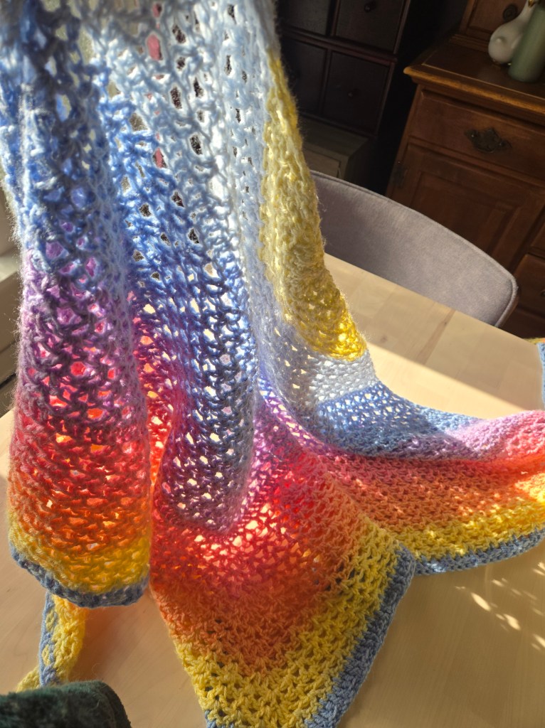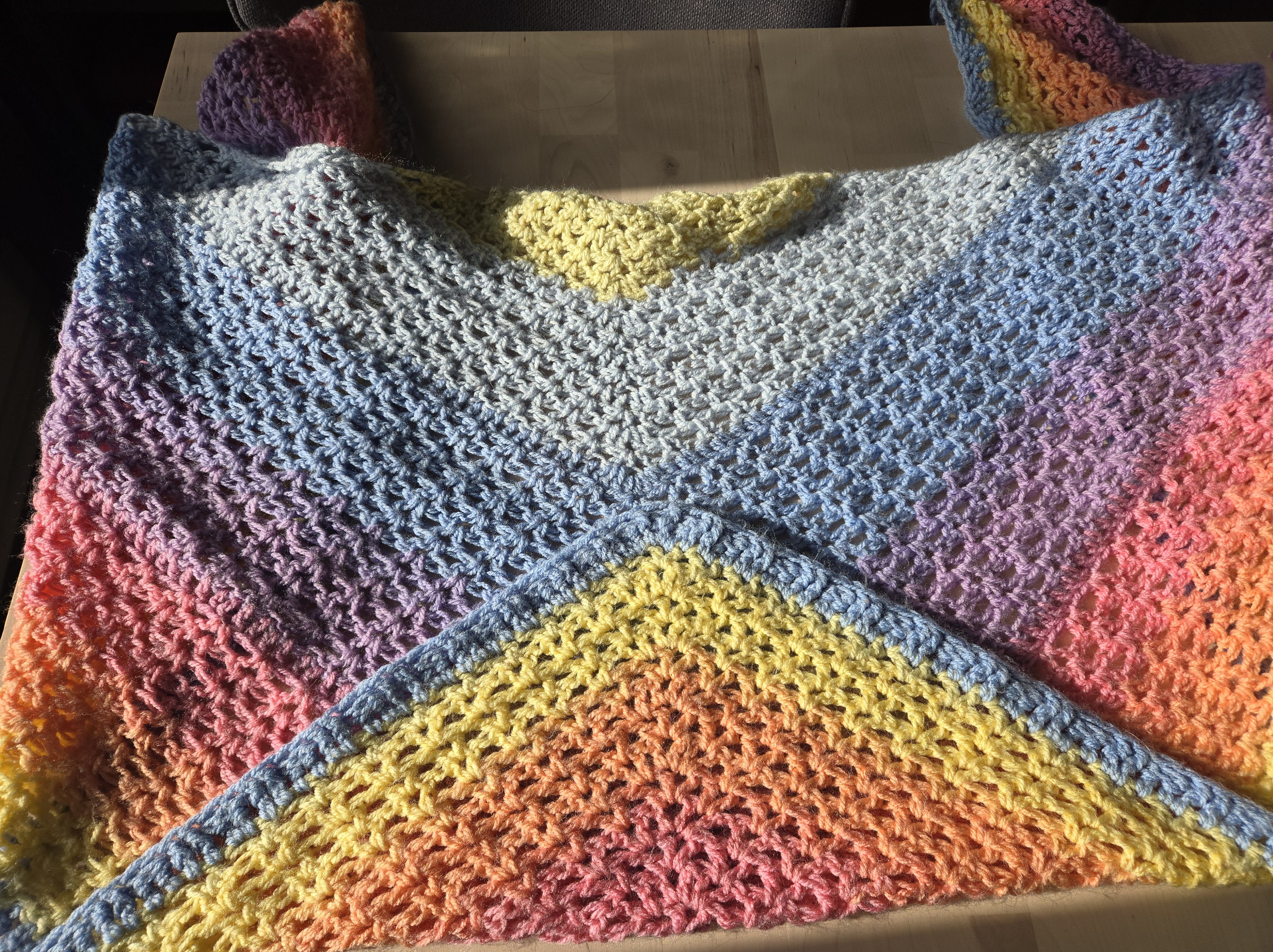 In my finished shawl I opted to only do one of the border rounds, as I personally liked that look with the yarn I was using. I will say, if you follow this pattern as written, it won’t come out looking exactly like mine. The yarn I used is actually a DK/light worsted weight (3) instead of standard worsted (4). (Hot tip: Make sure you read the yarn label lol. I figured all of LB’s Mandala varieties were the same weight, but they aren’t! Rookie mistake)